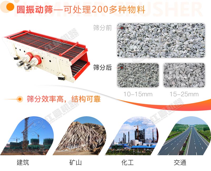 圓振動篩圓振動篩是一種做圓形振動、多層數(shù)、新型振動篩。圓振動篩采用筒體式偏心軸激振器及偏塊調(diào)節(jié)振幅,物料篩淌線長,篩分規(guī)格多,具有結(jié)構(gòu)可靠、激振力強(qiáng)、篩分效率高、振動噪音小、堅(jiān)固耐用、維修方便、使用安全等特點(diǎn),該振動篩廣泛應(yīng)用于礦山、建材、交通、能源、化工等行業(yè)的產(chǎn)品分級。