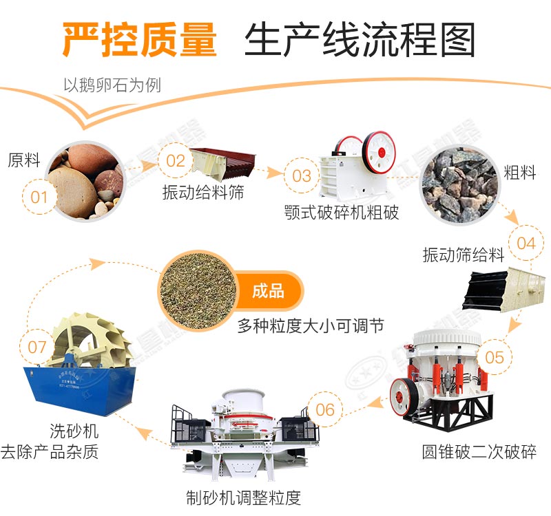天然原石經(jīng)振動(dòng)給料機(jī)送入顎式破碎機(jī)內(nèi)進(jìn)行初步的破碎,經(jīng)過振動(dòng)篩篩選,合格部分繼續(xù)送入細(xì)碎機(jī)進(jìn)行打沙加工,對(duì)于粒度要求嚴(yán)格的生產(chǎn)線,可以接入振動(dòng)篩,多重篩分能夠進(jìn)一步優(yōu)化成料品味,細(xì)化分級(jí),成品砂料品味更好,級(jí)配更合理。